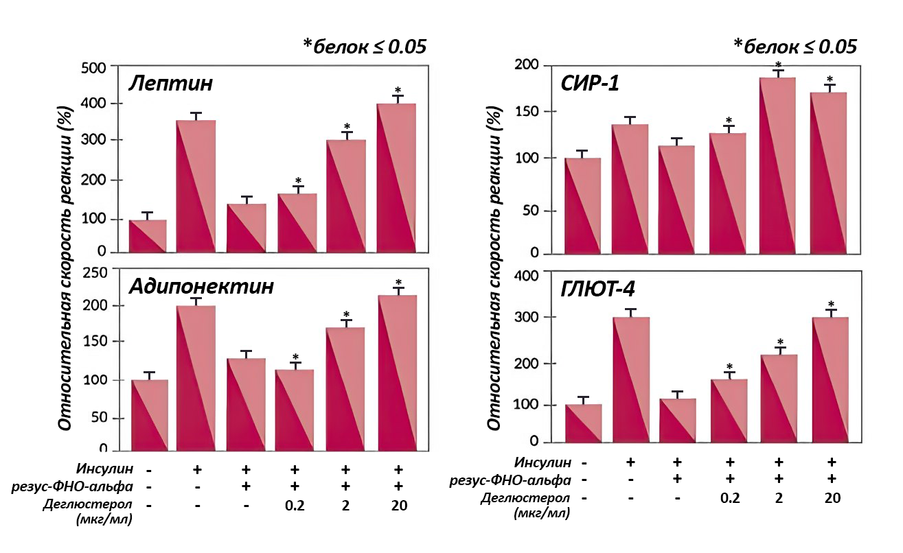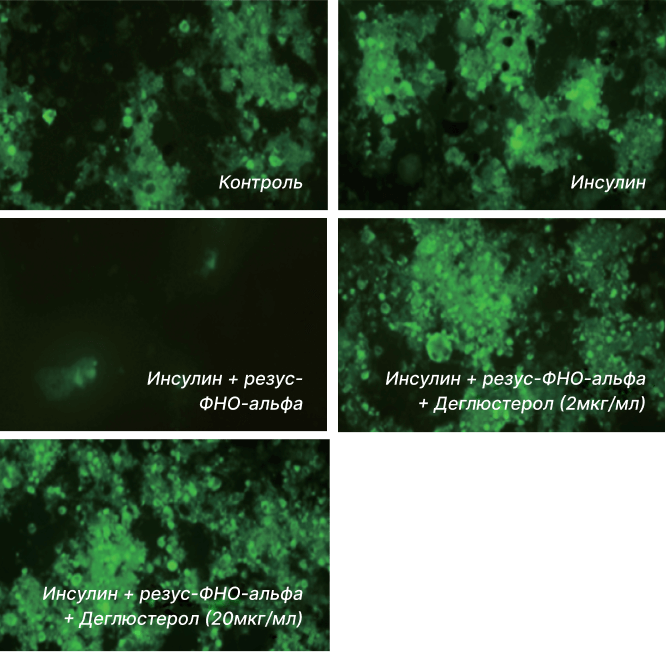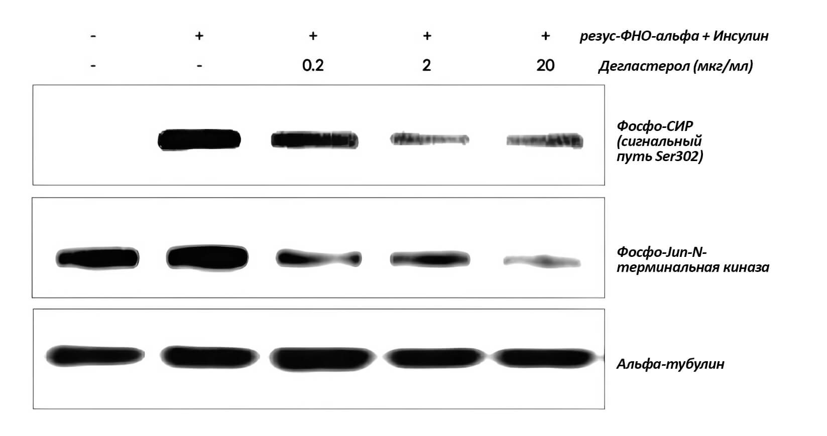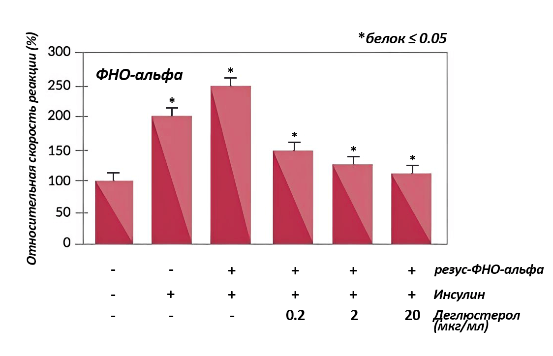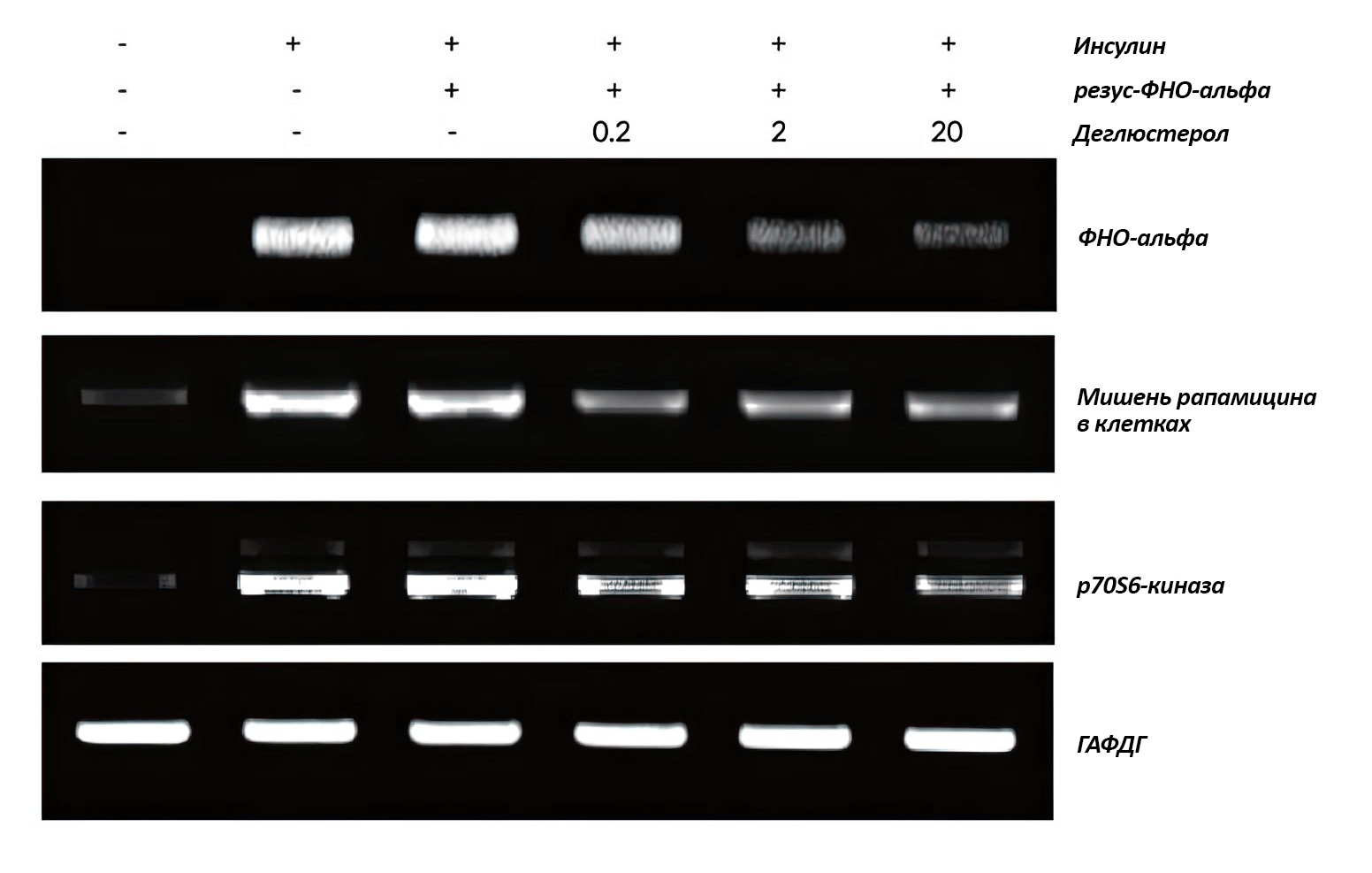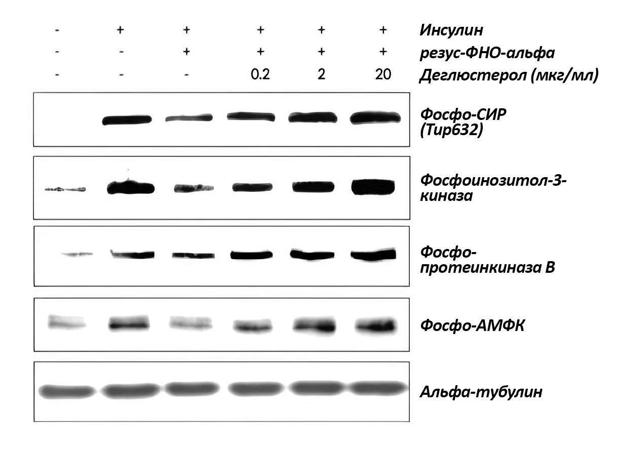 ФНО-альфа стимулировало понижающую регуляцию сигнала чувствительности к инсулину, фосфо-СИР (Tyr632), фосфоинозитол-3-киназе, фосфо-протеинкиназе В и фосфо-АМАПК, которые были восстановлены и увеличены при использовании Деглюстерола дозозависимым образом