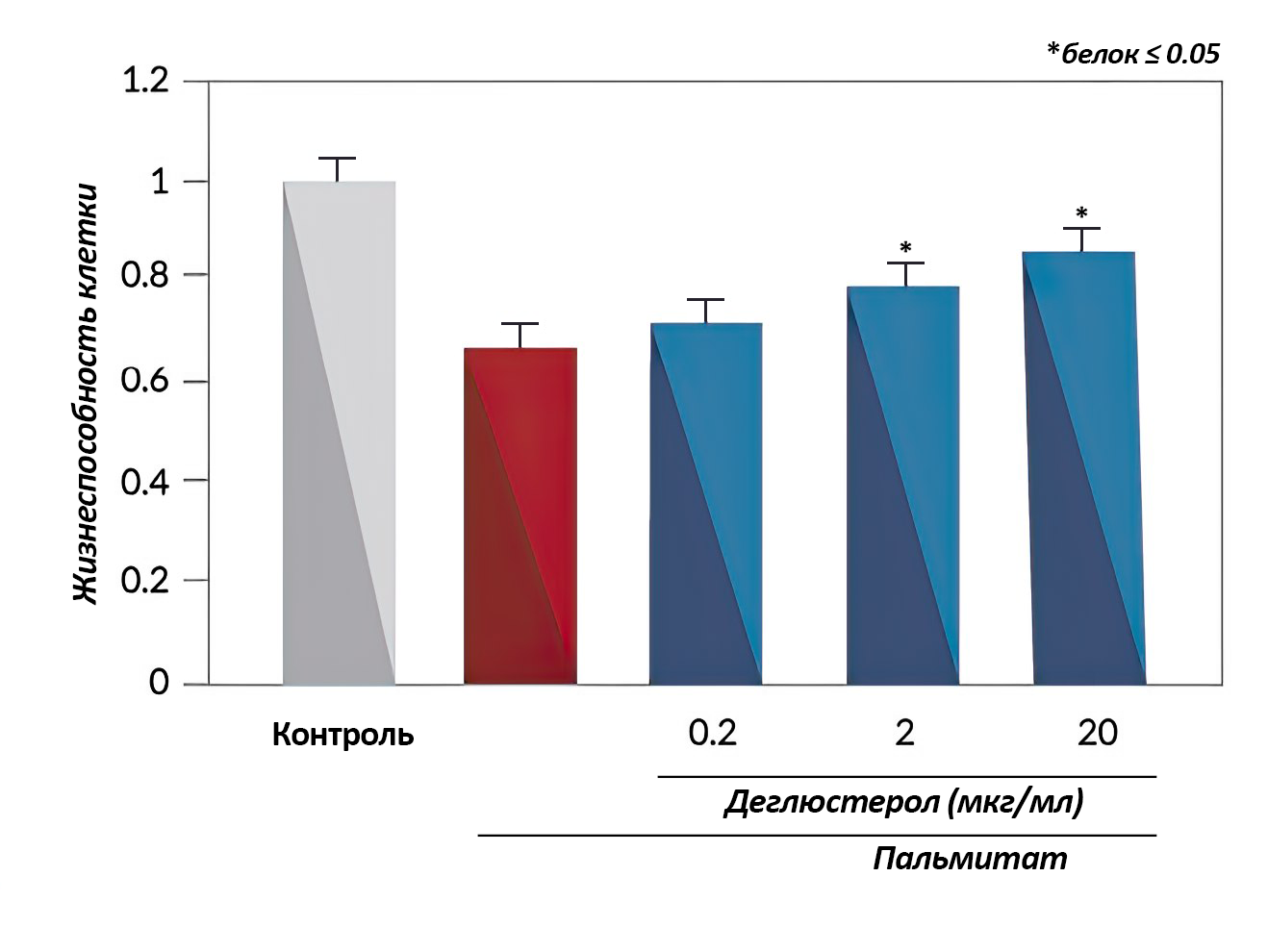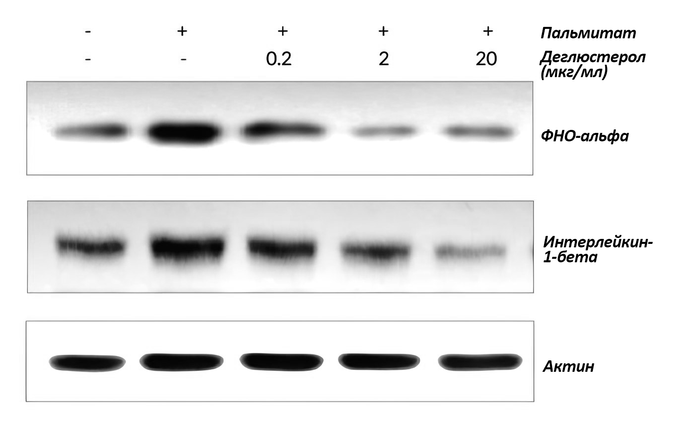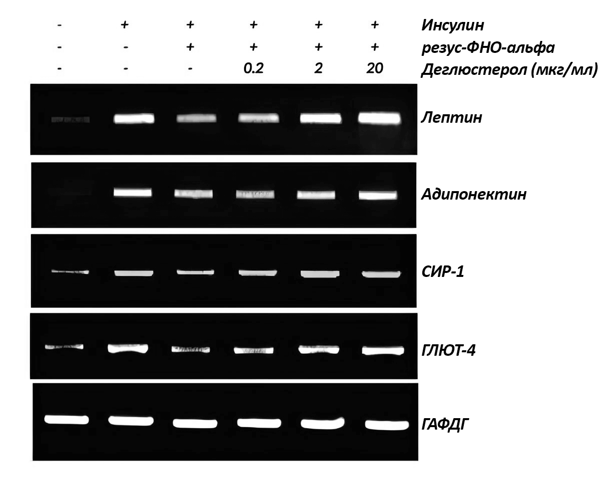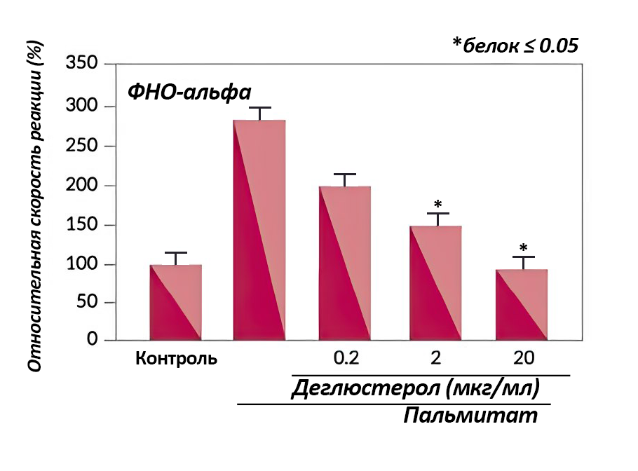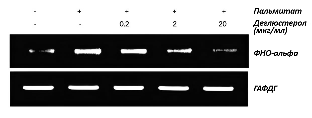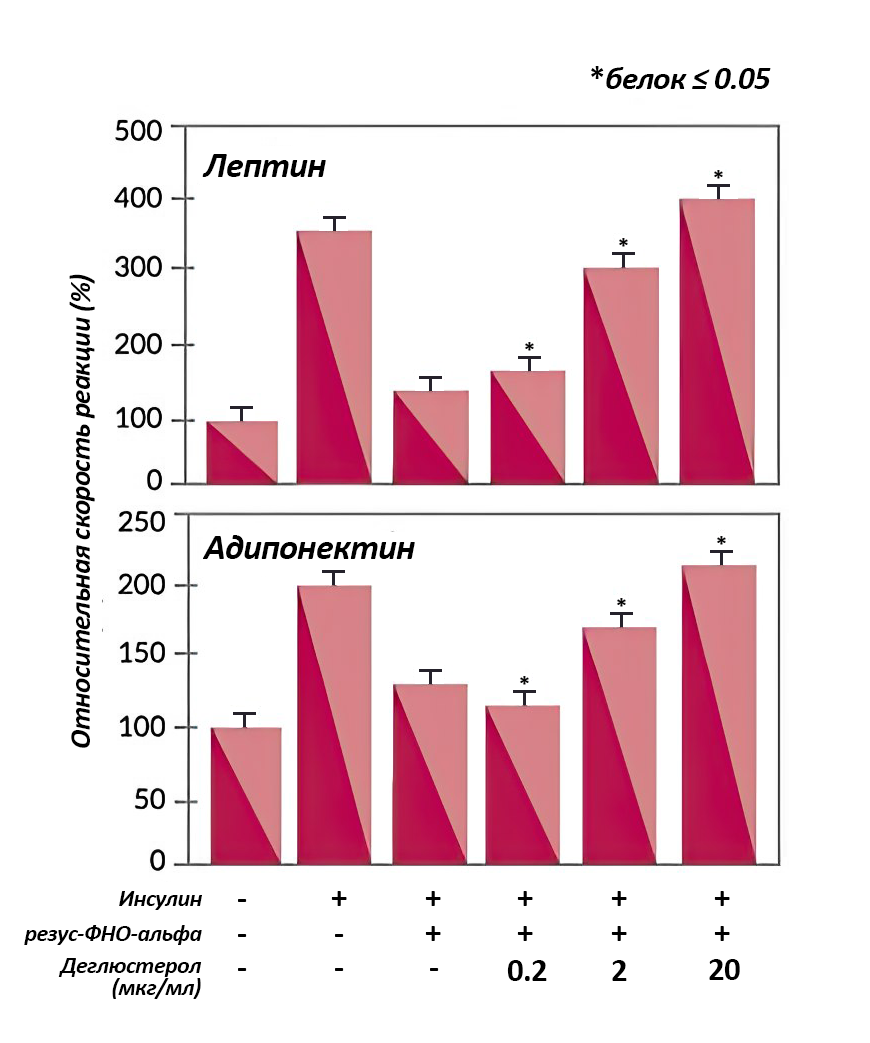 ФНО-альфа стимулировало понижающую регуляцию сигнала чувствительности к инсулину, фосфо-СИР (Tyr632), фосфоинозитол-3-киназе, фосфо-протеинкиназе В и фосфо-АМАПК, которые были восстановлены и увеличены при использовании Деглюстерола дозозависимым образом