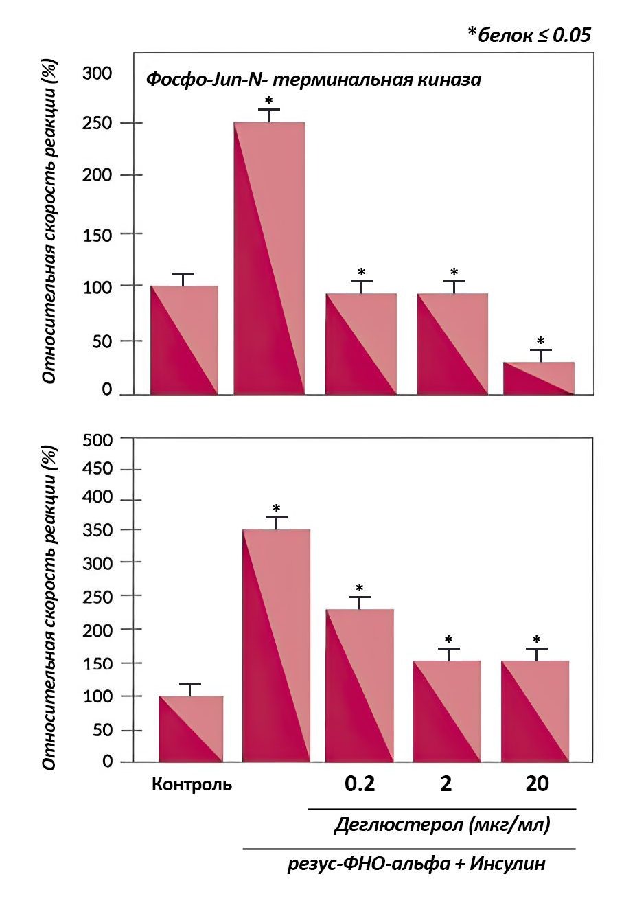 Уровни фосфорилирования сигнальных молекул, связанных с инсулинорезистентностью, стимулировались в комплексном применении резус-ФНО-альфы и инсулина, и они были снижены при использовании Деглюстерола.